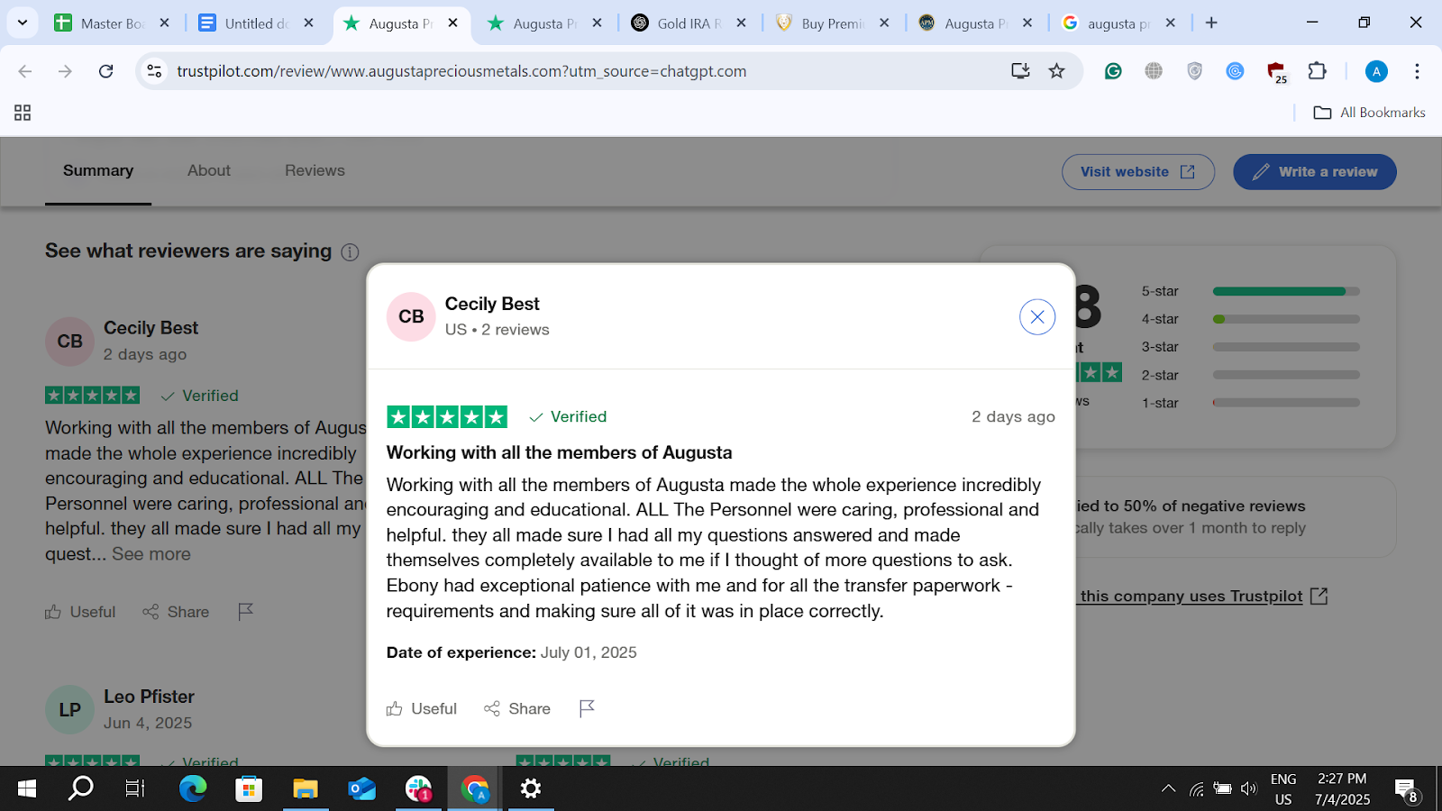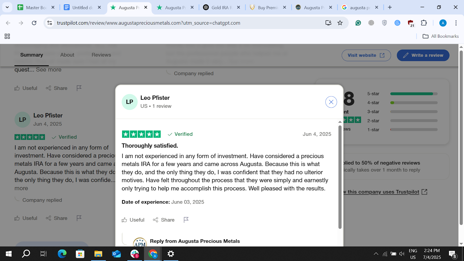 Augusta holds a flawless 4.8-star average across nearly 200 reviews on Trustpilot. The most recent feedback highlights clear communication and knowledgeable service: