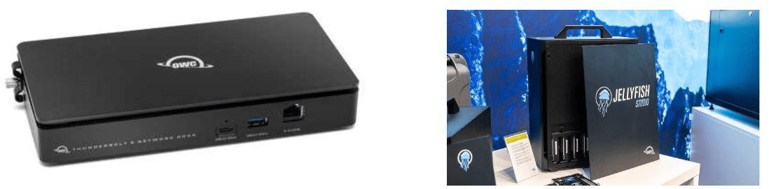 Top Performers – OWC introduced the new Thunderbolt 5 network dock (l) and Jellyfish S24server storage system.