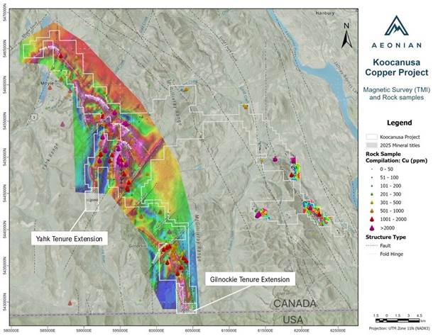 VANCOUVER, BC / ACCESS Newswire / October 27, 2025 / Aeonian Resources Ltd. (TSX.V:ALTN) (“ Aeonian ” or the “ Company “) is pleased to announce the expansion of its 100%-owned Koocanusa Copper Project in southeastern British Columbia through the acquisition of two new contiguous mineral tenures. The additions build on results from Aeonian’s recent airborne geophysical survey, which highlighted multiple high-priority magnetic anomalies along the 50 km copper corridor (see September 10, 2025 , news release). The expanded ground strengthens Aeonian’s control of very prospective structural and stratigraphic traps within the Purcell Basin, the same geological belt that hosts Montana’s world-class sediment-hosted copper-silver deposits.