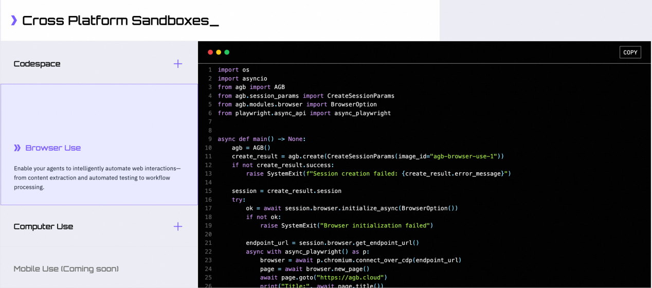 As AI agents expand beyond chat interfaces into real-world task execution – including browser automation, desktop control, and multimodal workflows – developers face growing challenges around environment isolation, cross-platform compatibility, and secure execution. AGBCLOUD addresses these barriers through a fully cloud-hosted sandbox framework optimized for agentic computing.