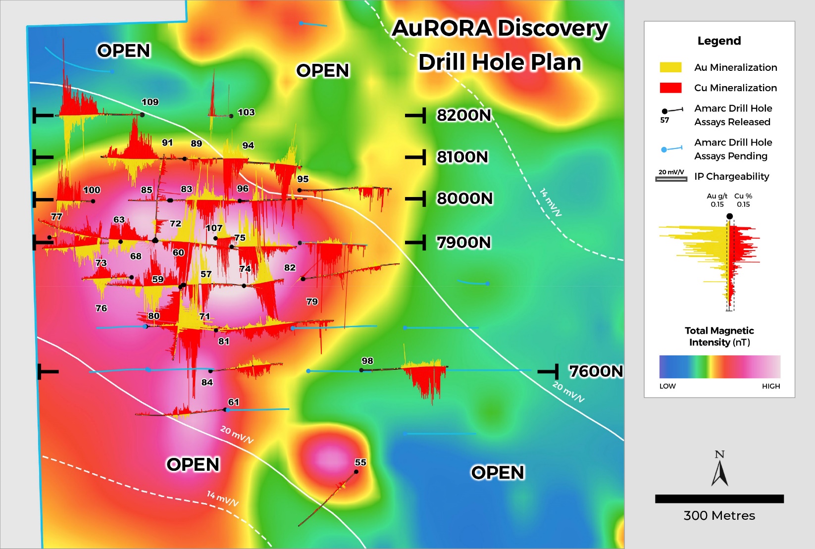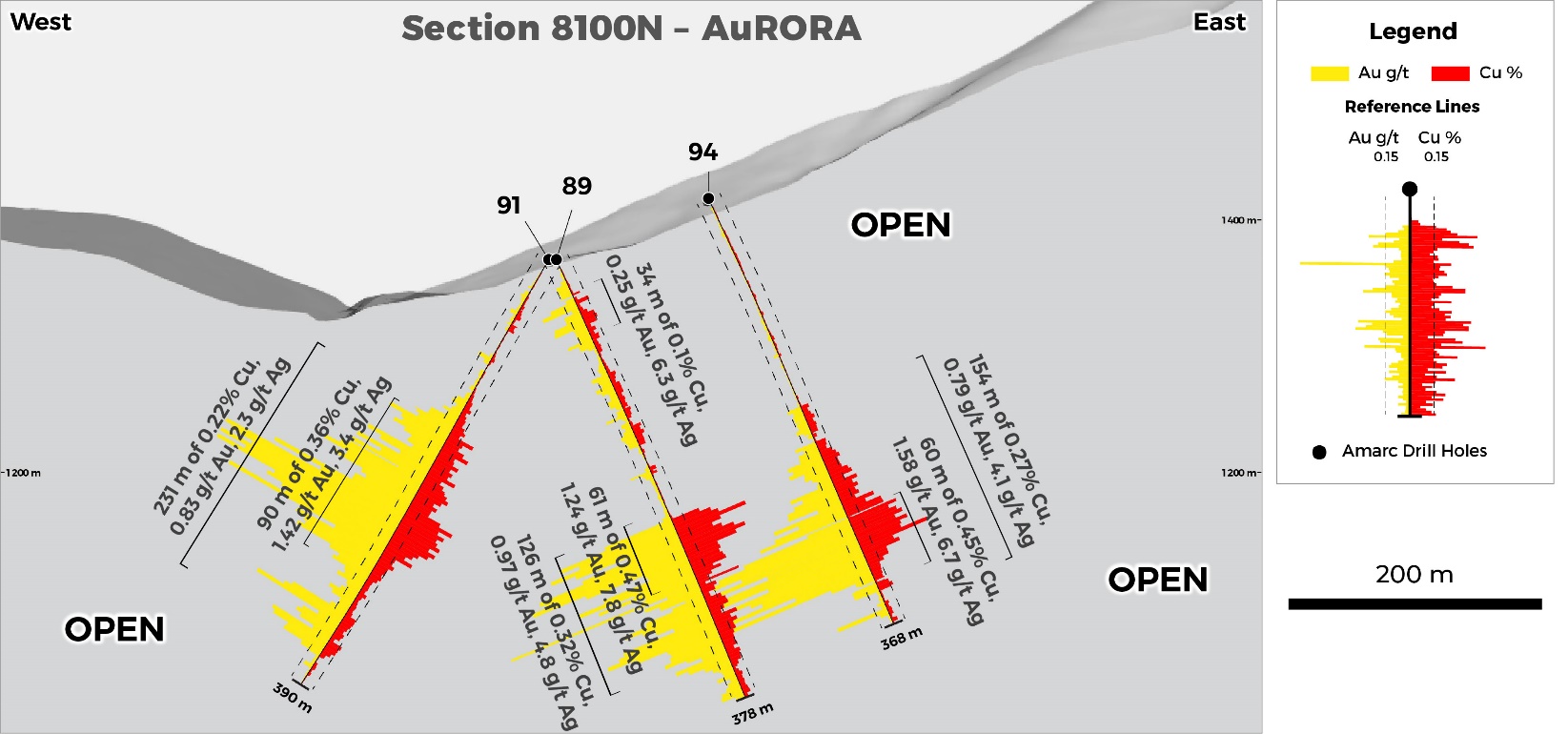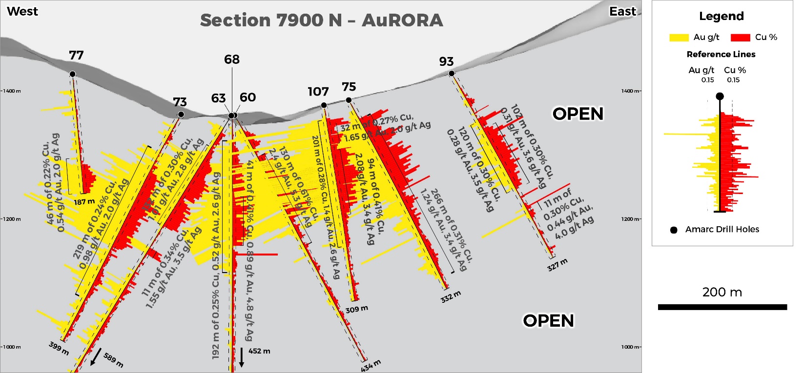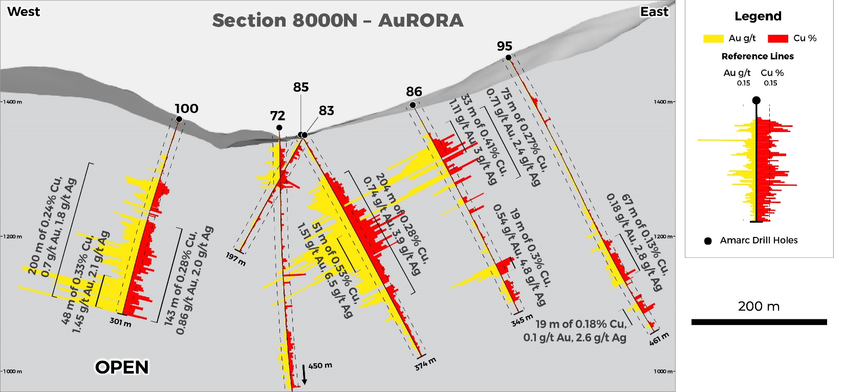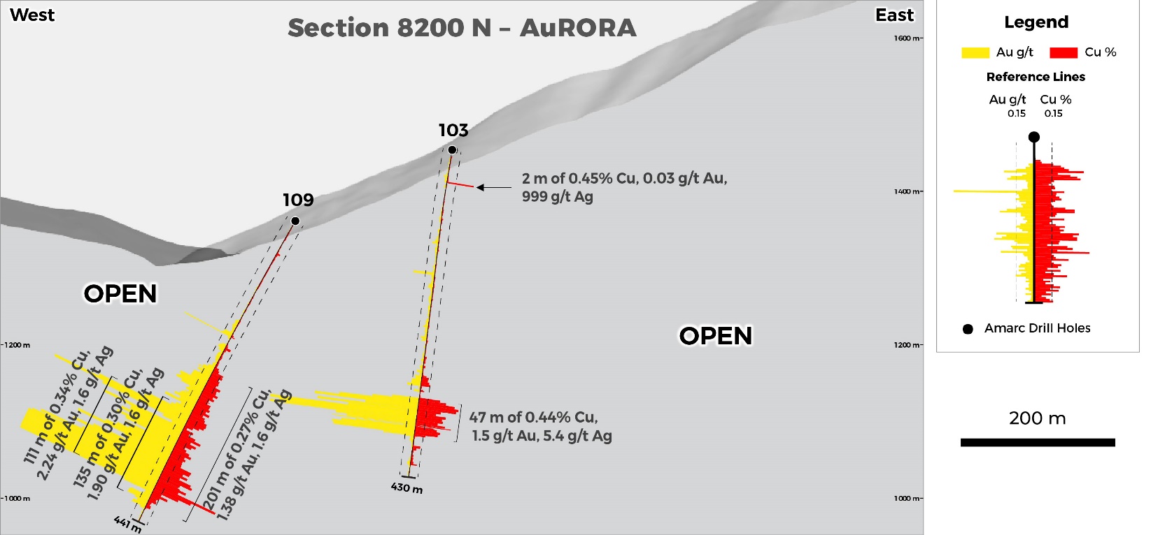 Results announced in November from six holes completed on Sections 8000N and 8100N successfully expanded AuRORA +200 m to the north (see Amarc release October 22, 2025). Today, we are announcing two drill holes (JP25103, JP25109) located on Section 8200N, which have expanded AuRORA a further +100 m to the north (Figures 1, 2, 3 and 4, and Tables 1 and 2).
