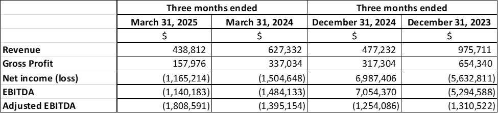 Revenue for the first quarter of 2025 decreased to $438,812 in comparison to Q4/2024 revenue of $477,232 as well as Q1/2024 revenue of $627,332. Adjusted EBIDTA loss for the first quarter of 2025 increased in comparison to Q4/2024 as well as Q1/2024 due to the increased in costs relating to personnel from an increase in head counts.