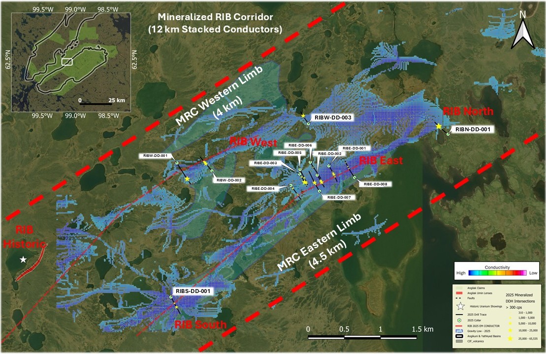 Cliff Revering, VP Exploration added: “We continue to see compelling evidence of the immense potential within the RIB regional target area. Our team has now discovered uranium mineralization across a 12 km graphitic structural corridor, and the results from the first RIB North drillhole, located over 1.4 km away from the nearest drilling, demonstrate impressive scale and continuity. These results highlight how our technical team is successfully translating a robust targeting strategy into meaningful new discoveries and set us up for a very exciting year ahead. Our thesis that the Angikuni Basin is an emerging new uranium district with substantial scale potential is steadily being validated.”