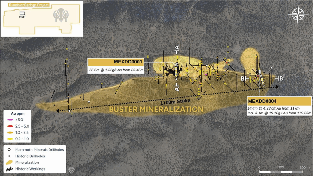 Strong initial results from Mammoth’s maiden diamond drilling program at Excelsior, with multiple shallow high-grade gold intercepts in the first three diamond holes at the Buster Mine Trend, validating and extending the geological model: