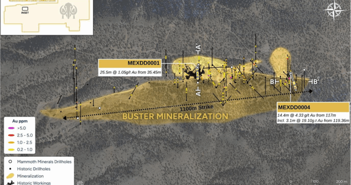 Maiden diamond drilling returns 4.33 g/t Au over 14.4m; geophysics defines large intrusive WHITE ROCK,