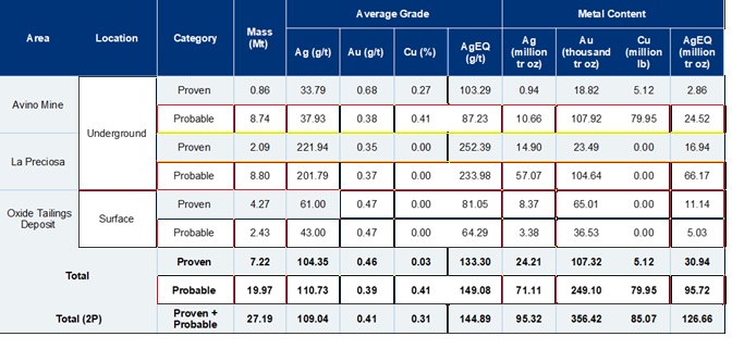Inaugural Proven and Probable Mineral Reserves at La Preciosa and Avino: The proven and probable mineral reserves at the Company’s three assets totaled 27 million tonnes containing 95 million ounces of silver at a grade of 109 g/t, 356 thousand ounces of gold at a grade of 0.41 g/t, and 85 million pounds of copper at a grade of 0.31%. This calculates to 127 million silver equivalent ounces at a grade of 145 g/t.