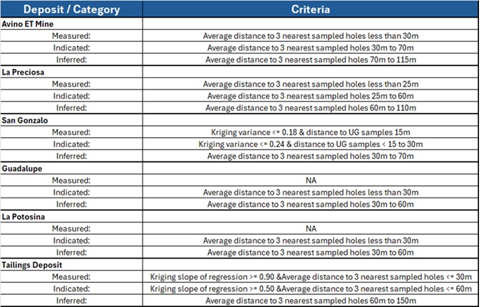 Mineral resources were estimated by ordinary kriging, optimized using kriging neighbourhood analysis and verified by means of nearest neighbour and inverse distance methods, swathplot comparisons of estimates and visual inspections. Block models were created for the San Gonzalo, and Avino Vein Systems ET, Guadalupe, La Potosina, La Preciosa and the Oxide Tailings deposit, and estimates were made using industry standard techniques.