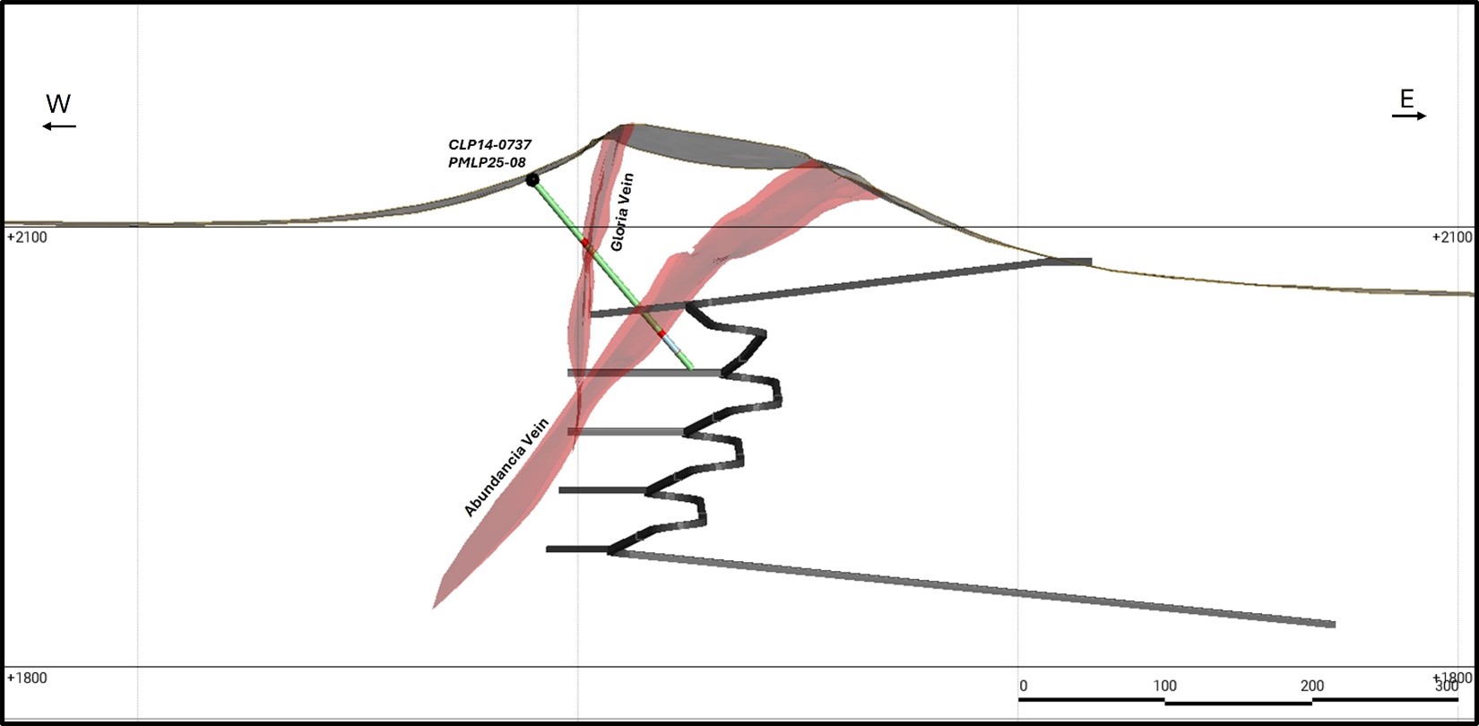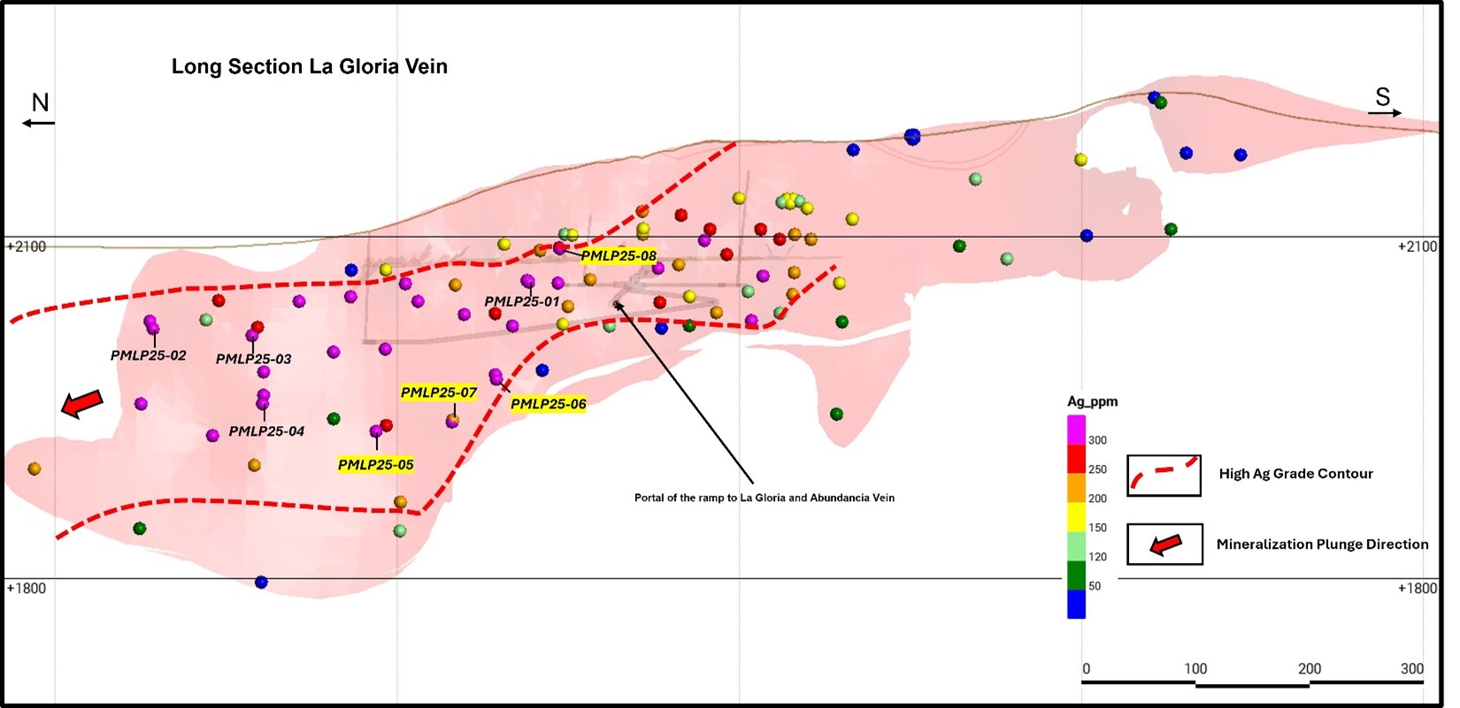 Hole PMLP 25-08 at Gloria: 306 g/t Ag and 1.15 g/t Au over 3.98 metres true width