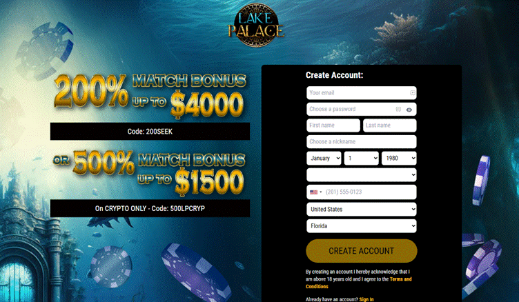 Welcome Bonus: 200% match bonus up to $4,000 on the first deposit (use code PALACE200).