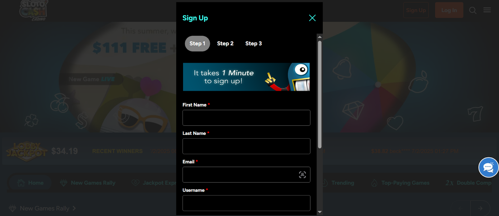 Visit the SlotoCash website and click the “Sign-Up” button in the top-right corner.