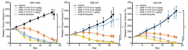 In preclinical PDX models, which use human tumor tissues to mirror real-world genetic complexity, MTX240 demonstrated dose-dependent efficacy in shrinking GIST in both non-resistant (left hand chart) and TKI-resistant tumors (middle and right hand chart) as illustrated below [3]: