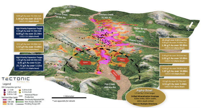 Alpha Bowl Drilling Now Connects to Chicken Mountain, Establishing > 3 km of Continuous Gold