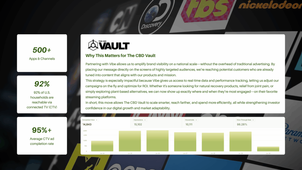 “This initiative represents one of the most important and scalable steps forward in CBDL’s history,” said Lisa Nelson, President & CEO of CBDL. “With Vibe, we’re not just buying ad space – we’re owning the channel to our core audience. This technology allows us to place the right product in front of the right person at the right time. That means greater efficiency, greater visibility, and greater returns.”