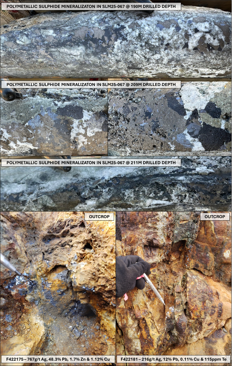 SLM25-067, the first drill hole completed of the 2025 season, successfully intersected repetitive zones of argentiferous galena and sphalerite-bearing sulphide mineralization for over 150m along this trend and confirmed continuity of mineralization intersected in 2022 to 182m true depth (211m drilled depth).
