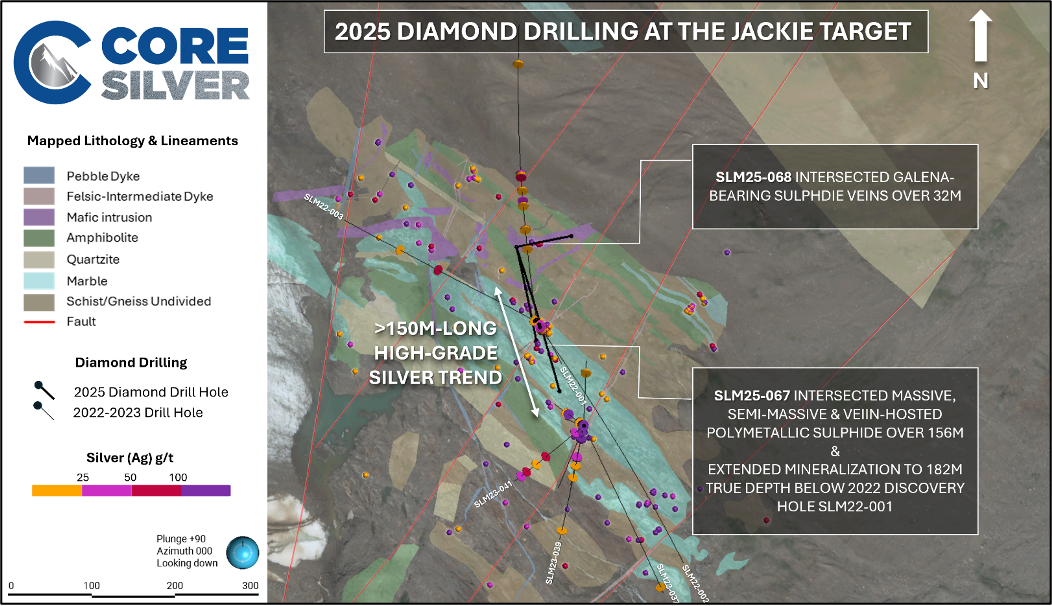 VANCOUVER, BC / ACCESS Newswire / October 1, 2025 / Core Silver Corp. (“Core Silver” or the “Company”) (CSE:CC)(FSE:8ZR)(OTC.QB:CCOOF) is pleased to provide an update for the 2025 diamond drilling at the Jackie Target (“ Jackie “) at the Silver Lime Polymetallic Project (the “ Project “), central Blue Property (the “ Property “), Atlin Mining District of NW British Columbia.