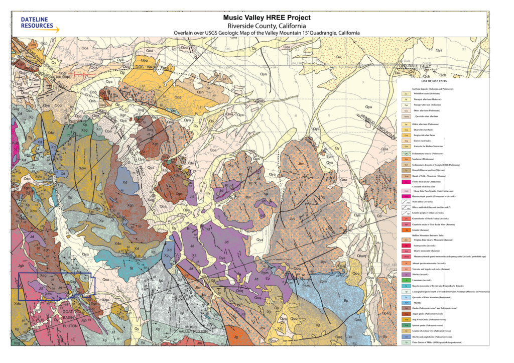 In February 2026, Dateline announced the acquisition of the Music Valley Heavy Rare Earth Project in Riverside County, California. The region has known HREE mineralisation from USGS rock chip sampling, however it has not been subjected to modern exploration techniques.