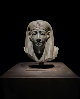 Advanced material analysis, including optical petrography, SEM imaging and X-ray spectrometry, confirmed the stone as Egyptian metagreywacke, highly prized in the Late Period for sculptures of royal and divine figures. Recent scholarship has linked the bust to a known corpus of works, attributed to an ancient Egyptian workshop or artist known as the ‘Greywacke Master’.