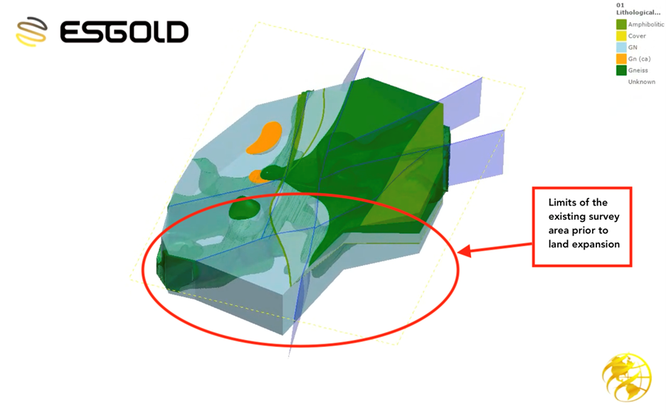 To date, only a portion of ESGold’s land package has been evaluated using modern deep-penetrating geophysics.