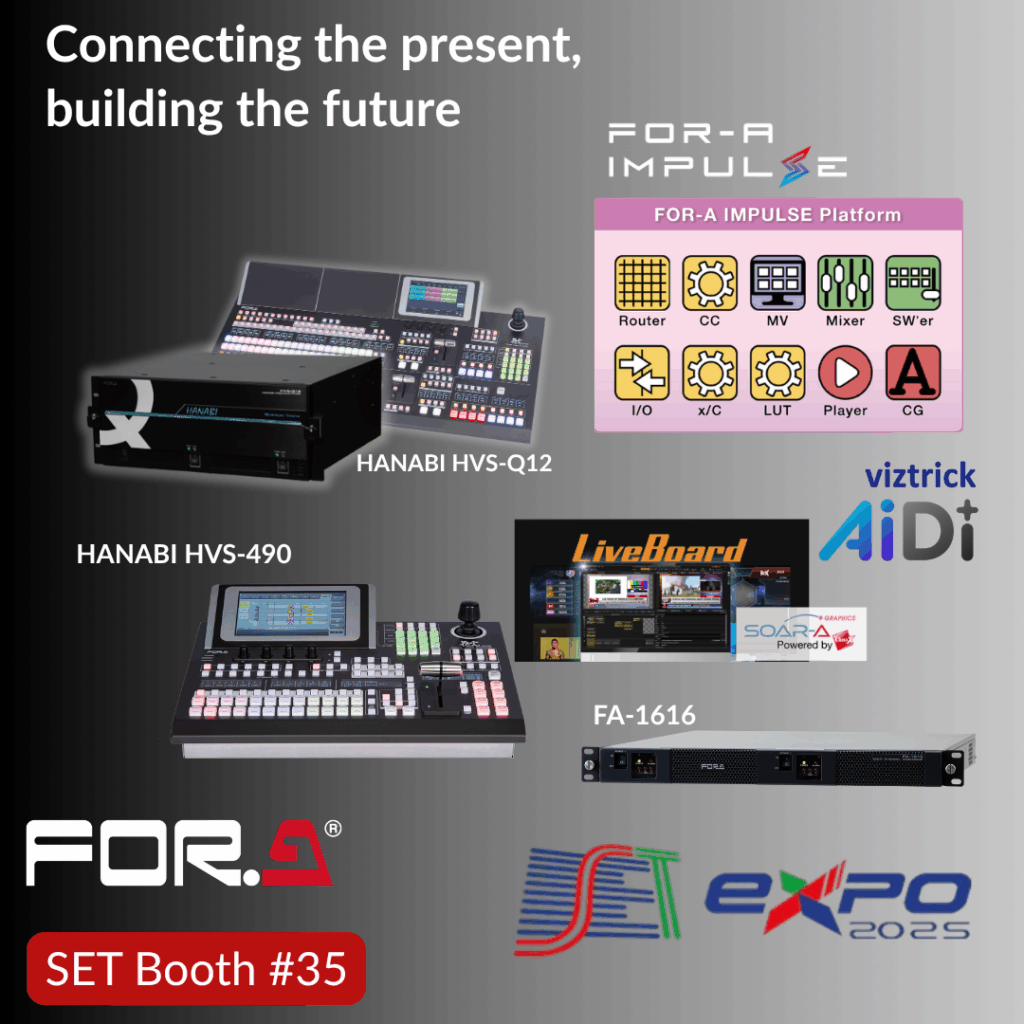 FOR-A Latin America and the Caribbean (LAC) will showcase several turnkey broadcast and video production suites with centralized control during SET Expo 2025, running August 19-21 in Sao Paulo. Several integrated packages running on Insight servers will feature: the two M/E HANABI HVS-Q12 video switcher, the HVS-490 video switcher, the FA-1616 multi-channel processor, the ClassX Liveboard graphics playout engine, the FOR-A IMPULSE live production platform, and viztrick AiDi intuitive On-Device AI solution.