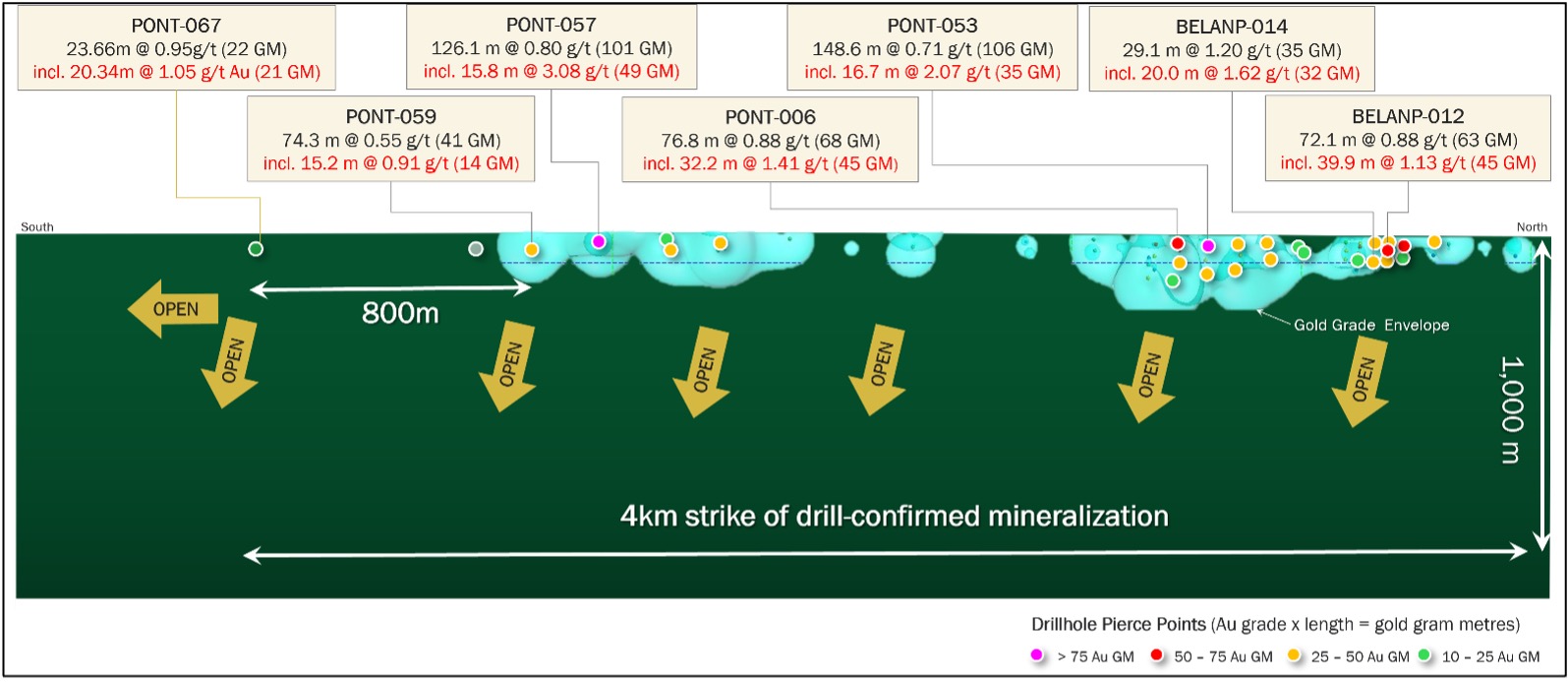 PONT067: 20.34m @ 1.05 g/t Au (a significant 800m step-out to the south, extending the total strike to 4km).