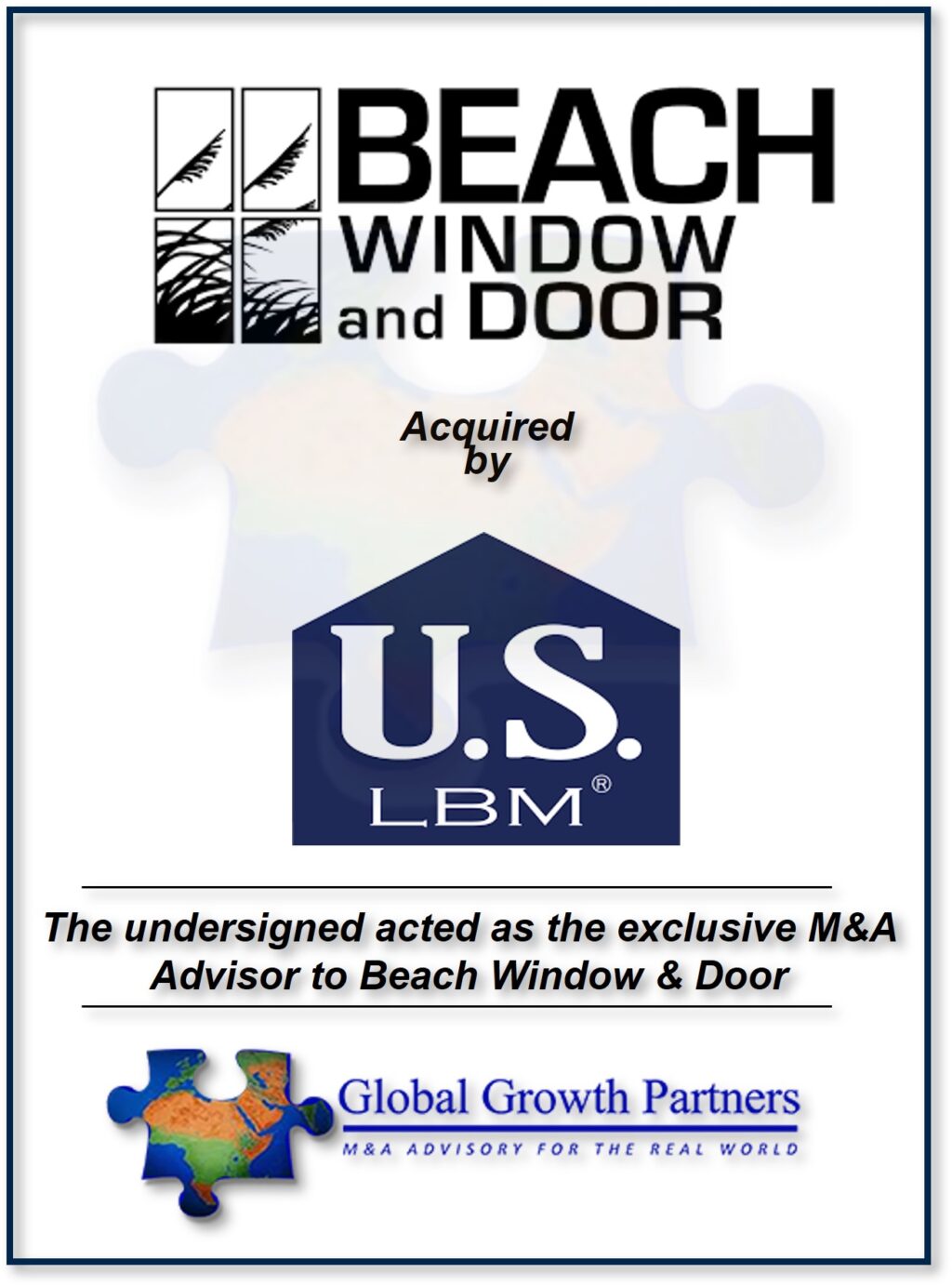 While many window and door companies have abandoned customer service, Beach has made it their core foundational philosophy; and it has been their core differentiator in the marketplace. We were honored to assist Harvey and David through the transaction. Good men, solid values,” said Jason Patterson, Senior Managing Director of Global Growth Partners.
