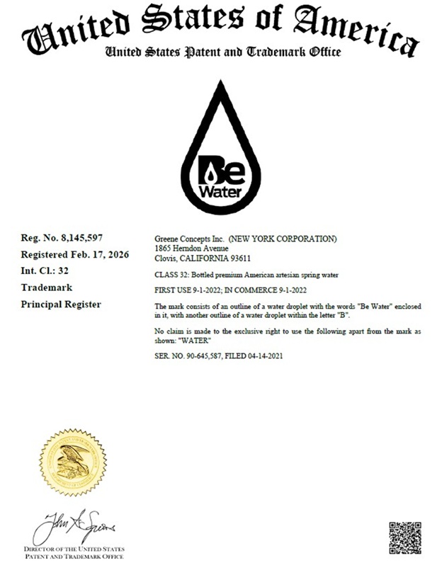 “This registration reflects the years of work invested in developing Be Water as a premium American artesian spring water brand,” Greene added. “As we continue expanding distribution and building awareness, having our trademark fully registered adds clarity, credibility, and long-term protection to everything we are building.”