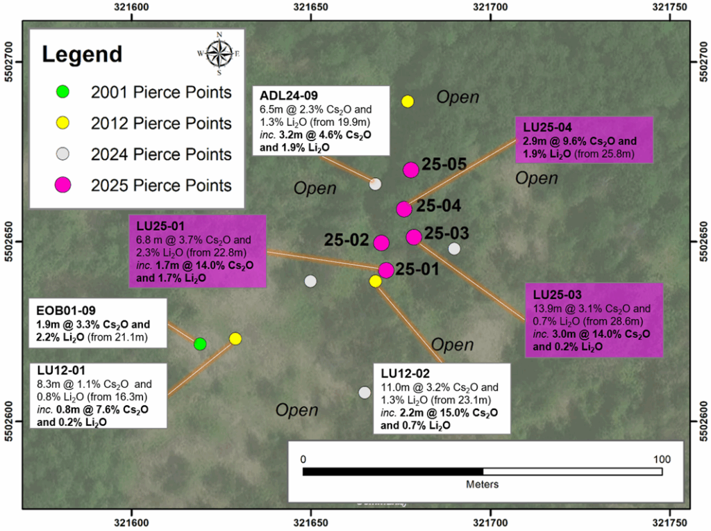 3.01 metres with 14.0% Cs2O and 0.50% Rb2O (LU25-03; from 31.5 metres) including 0.61 metres with 24.2% Cs2O and 0.50 metres with 24.7% Cs2O