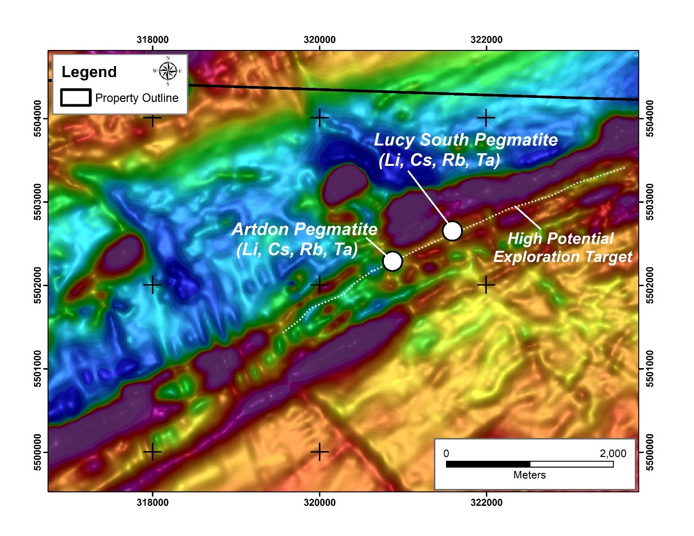Figure 2: Drill-defined locations of the Lucy South and Artdon LCT pegmatites overlain on a total field magnetic image based on the Company’s fall 2024 fixed-wing magnetic and radiometric survey. The dotted white line identifies the current regional exploration target that follows an extensive magnetic low anomaly that hosts both the Artdon and Lucy South pegmatites. The latter two areas may be part of a single LCT pegmatite – but are separated by several hundred metres where no drilling has yet occurred.