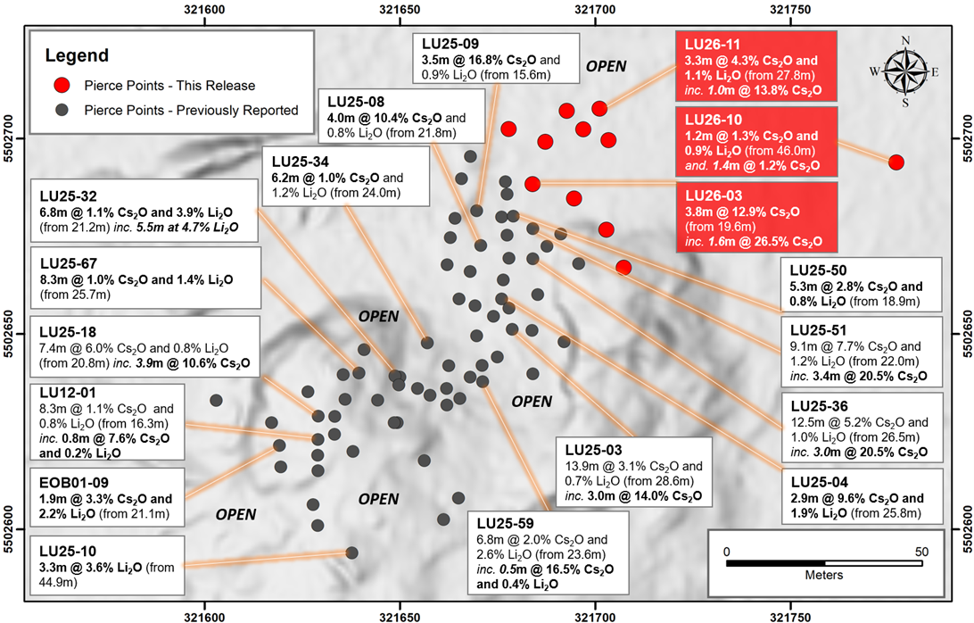 3.8m with 12.9% Cs2O including 1.6m with 26.5% Cs2O (LU26-03; from 19.6 metres)