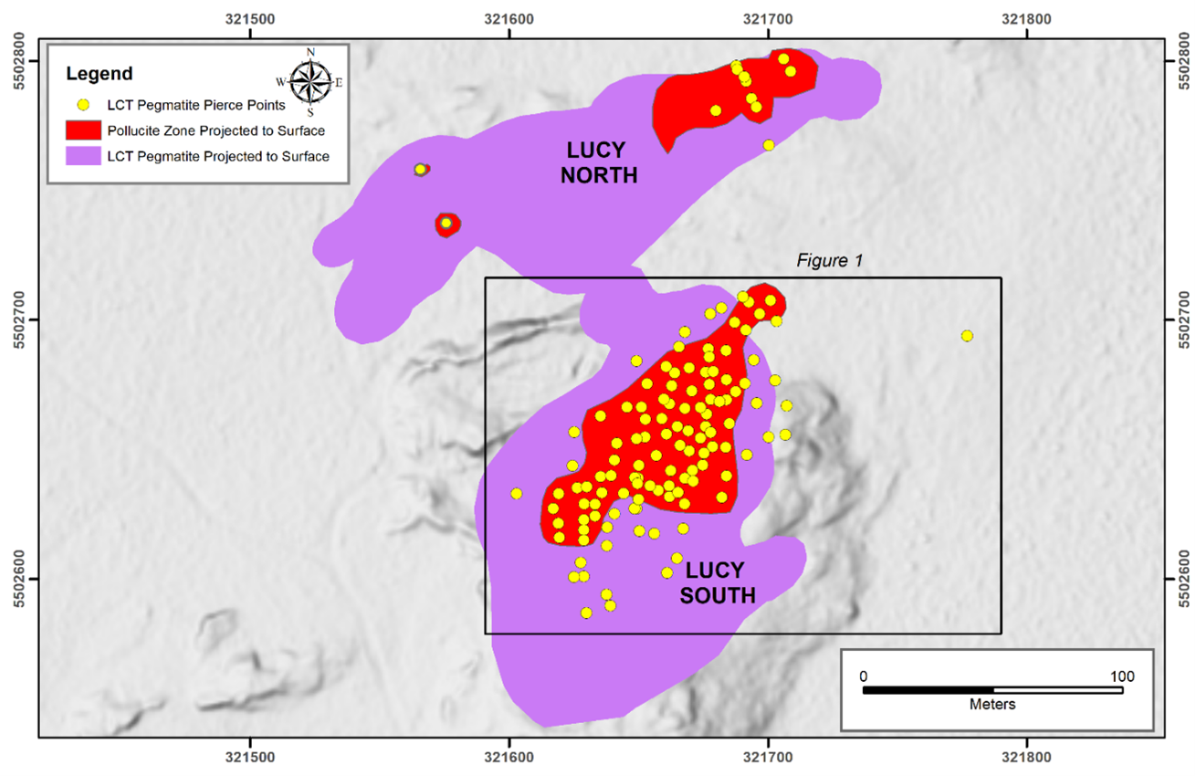 Significant tantalum (e.g., 0.9m with 1.48% Ta2O5 in hole LU26-05, from 39.2 metres) and rubidium (e.g. 1.2m with 1.53% Rb2O in LU26-10, from 46.0 metres) were also intersected, further highlighting the extremely fractionated nature of the Lucy South pegmatite.