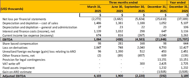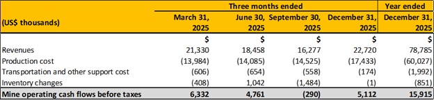 The following tables summarize the Company’s consolidated operating and financial results for the three months ended December 31, 2025, as compared to the three months ended September 30, 2025. All amounts are expressed in thousands of United States (“US”) dollars except per share amounts, realized prices, tonnes and ounces or unless otherwise stated.