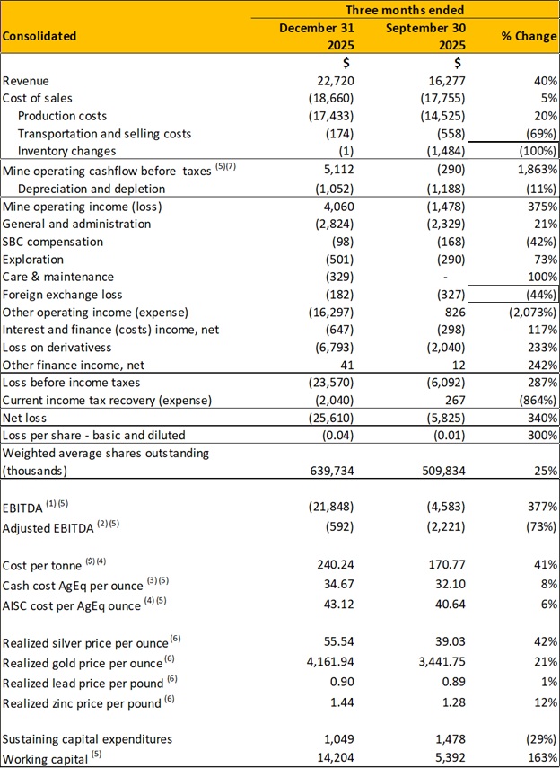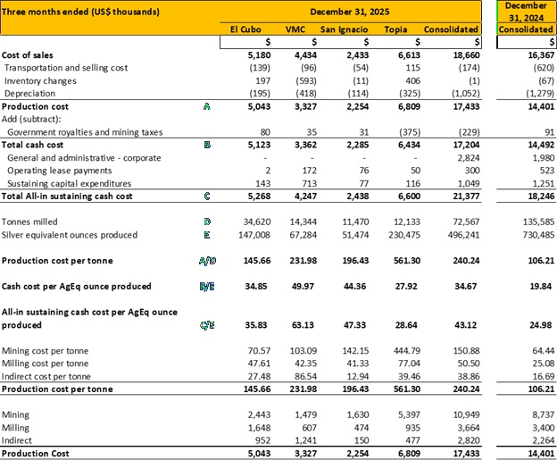 Silver equivalents (AgEq) are calculated using 75.73:1 (Ag/Au), 0.02:1 (Ag/Pb) and 0.03:1 (Ag/Zn) ratio for Q4 2025 and an 87.70:1 (Ag/Au), 0.02:1 (Ag/Pb) and 0.03:1 (Ag/Zn) ratio for Q3 2025, respectively.
