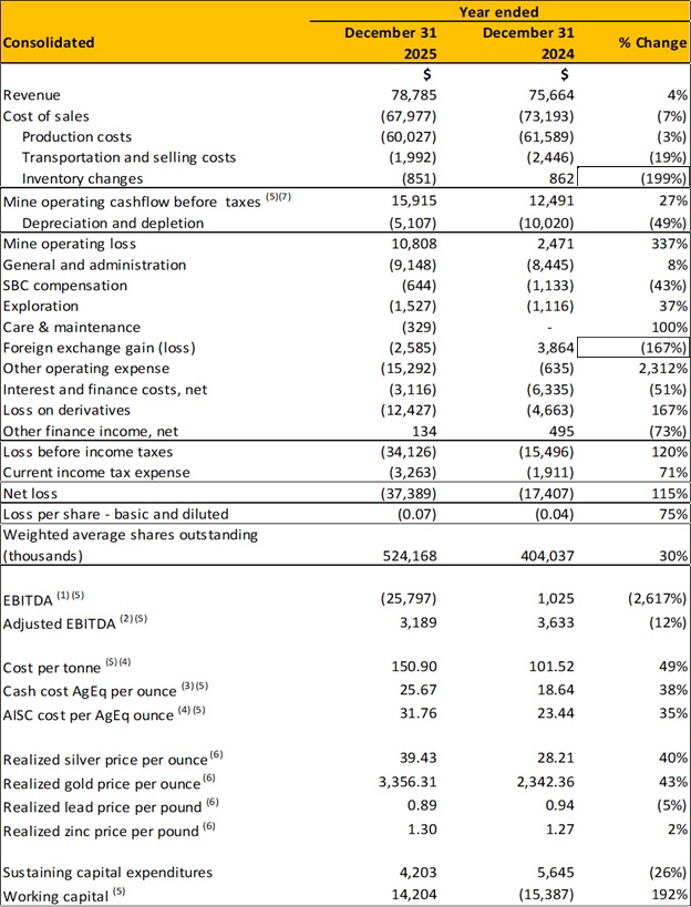 The following tables summarize the Company’s consolidated operating and financial results for the year ended December 31, 2025 as compared to the year ended December 31, 2024. All amounts are expressed in thousands of United States (“US”) dollars except per share amounts, realized prices, tonnes and ounces or unless otherwise stated.