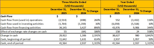 The table below presents a summary of the Company’s consolidated cash flow for the three-month and twelve-month periods ended December 31, 2025, and 2024.