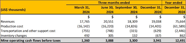 Mine operating cash flow before taxes is a non-IFRS measure that does not have a standardized meaning prescribed by IFRS and therefore may not be comparable to similar measures presented by other issuers. Mine operating cash flow is calculated as revenue minus production costs, transportation and selling costs and inventory changes. Mine operating cash flow is used by management to assess the performance of the mine operations, excluding corporate and exploration activities, and is provided to investors as a measure of the Company’s operating performance.