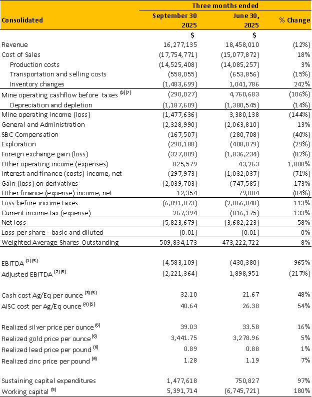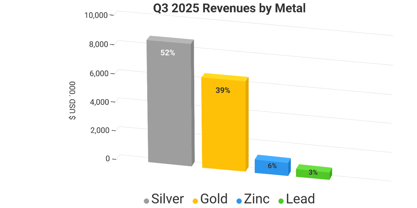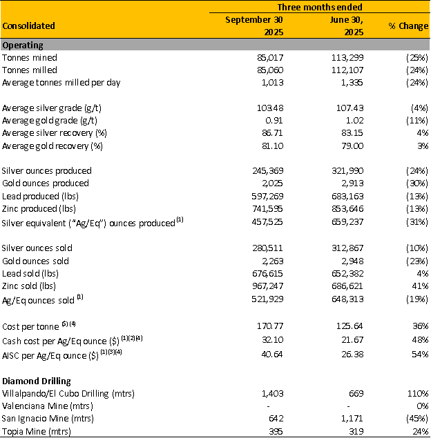 Production for the quarter of 457,525 silver-equivalent ounces (AgEq) comprising 245,369 ounces of silver, 2,025 ounces of gold, 597,269 pounds of lead and 741,595 pounds of zinc. Silver equivalents are calculated using an 87.70:1 (Ag/Au), 0.02:1 (Ag/Pb) and 0.03:1 (Ag/Zn) ratio for Q3 2025.