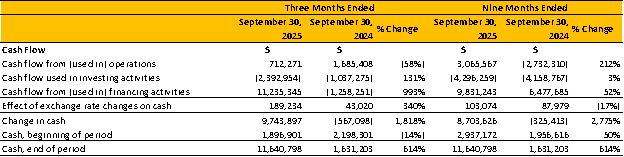 The table below presents a summary of the Company’s consolidated cash flow for the three-month and nine-month periods ended September 30, 2025 and 2024.