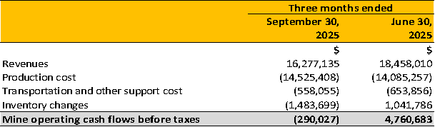 The financial results were as follows for the three months ended September 30, 2025 and June 30, 2025. The Company notes that 44% of the net loss consists of non-cash items, including foreign exchange loss, share-based compensation, and loss on derivatives stemming from the Company’s sole outstanding loan.