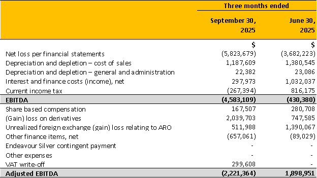 As of the end of the quarter, the Company held cash and cash equivalents of US$11.6 million. Subsequent to the end of the quarter, on October 9, 2025, the Company announced the closing of a bought deal public offering for gross proceeds of C$43.5M (Approximately US$31.1M) (See GSilver news release).