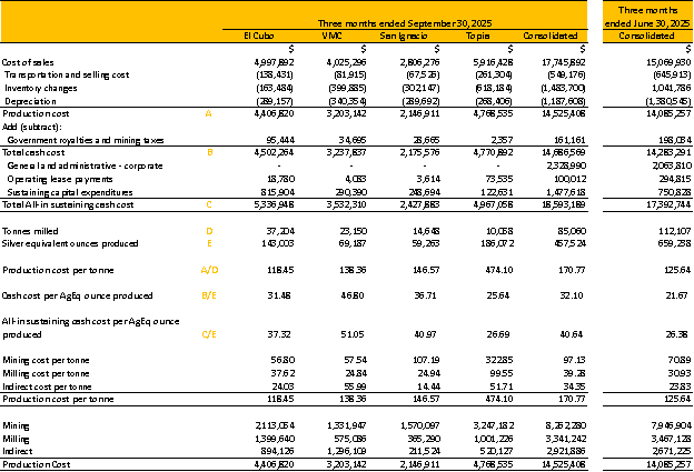 Silver equivalents are calculated using 87.70:1 (Ag/Au), 0.02:1 (Ag/Pb) and 0.03:1 (Ag/Zn) ratio for Q3 2025 and a 97.58:1 (Ag/Au), 0.03:1 (Ag/Pb) and 0.04:1 (Ag/Zn) ratio for Q2 2025, respectively.