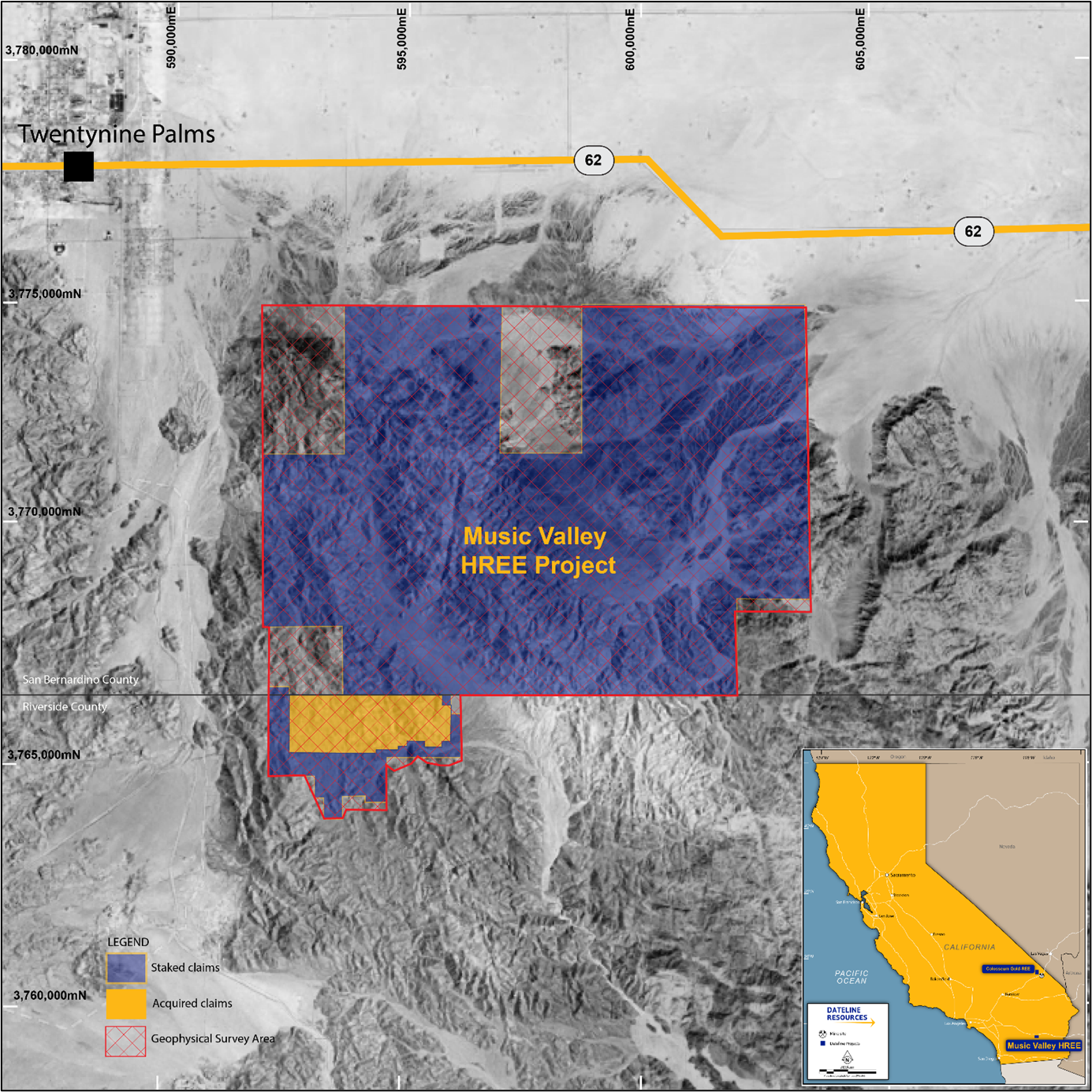 In March 2026, Dateline consolidated the Music Valley Heavy Rare Earth Project in Riverside and San Bernardino Counties, California. The region has known HREE mineralization from USGS rock chip sampling, however it has not been subjected to modern exploration techniques.