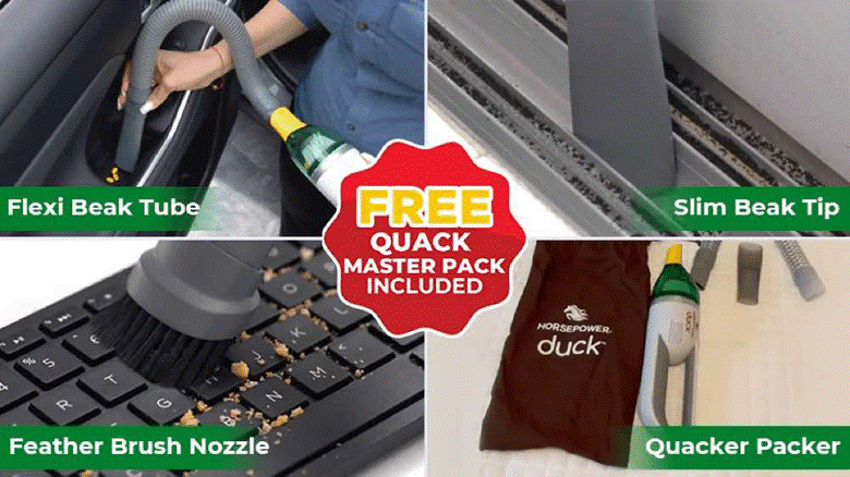 FREE Quack Master Pack Attachments: Each Horsepower Duck Vacuum comes with the exclusive Quack Master Pack at no extra cost. This set includes tools like the Flexi Beak Tube, which reaches tight spaces, cracks, and corners. These attachments make cleaning upholstery, car seats, cup holders, shelves, and even delicate surfaces like keyboards simple and effective.