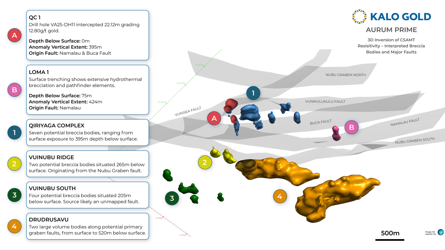 Figure 1. Aurum Epithermal Field – Geophysical Resistivity Model (3D-CSAMT) and Structural Interpretation. Three-dimensional model showing sixteen high-resistivity anomalies interpreted as breccia bodies within the Qiriyaga Complex (1) and surrounding structural corridors (2-4 and B). Seven potential breccia bodies are delineated at Qiriyaga Complex, extending from surface to 395 m depth, including QC1 (A) where VA25-DH11 intersected 22.12 m @ 12.80 g/t Au. Additional targets are defined at Vuinubu Ridge (2), Vuinubu South (3), and Drudrusavu (4), extending to depths of 200-520 m along the Nubu Graben, Vunisea, Loma (B) and Buca fault intersections. These zones are interpreted as diatreme or hydrothermal breccia conduits representing key fluid pathways within a vertically extensive epithermal system.