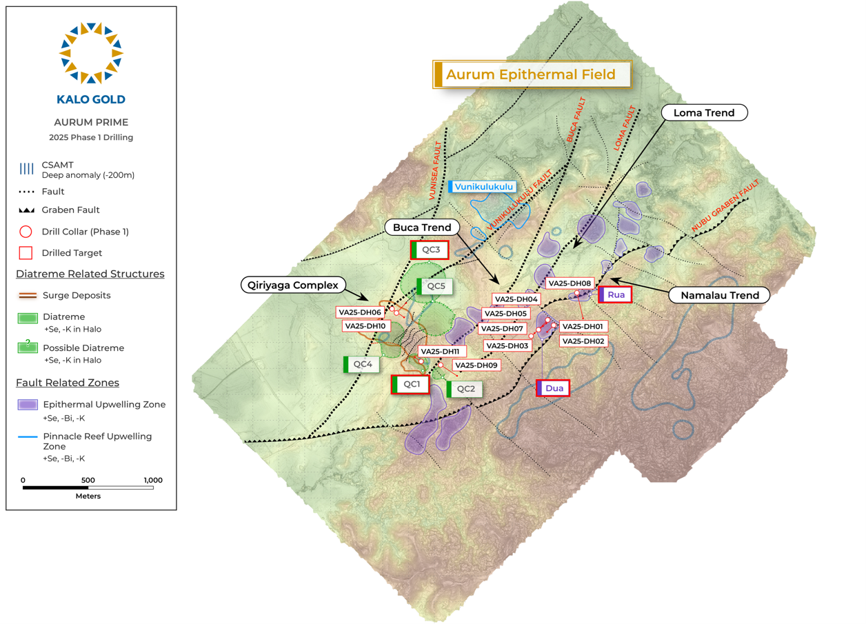 Figure 2: Aurum Epithermal Field – 2025 Phase 1 Drilling – Map showing the distribution of major structural corridors and epithermal upwelling features within the Aurum Epithermal Field. Phase 1 drilling tested two of eighteen identified epithermal upwelling zones – Dua and Rua – within the Namalau, Loma and Buca Trends, and the QC1 diatreme at the Qiriyaga Complex.