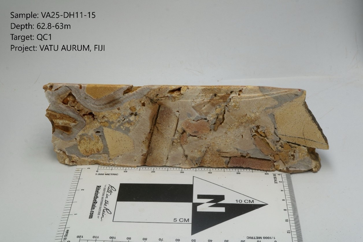 Image 1: VA25-DH11 (62.80-63.00 m depth – 18.10 g/t Au) showing chalcedonic quartz-cemented hydrothermal breccia.