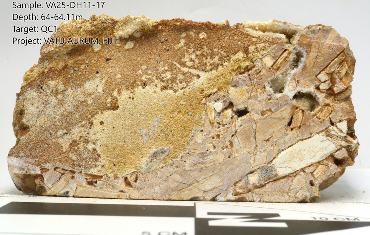 Image 2: VA25-DH11 (64.00-64.11 m depth – 83.30 g/t Au) showing chalcedonic quartz-cemented hydrothermal breccia.