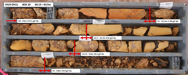 22.12 m @ 12.80 g/t Au from 43.48 m depth – VA25-DH11 (true width of 20.70 m)