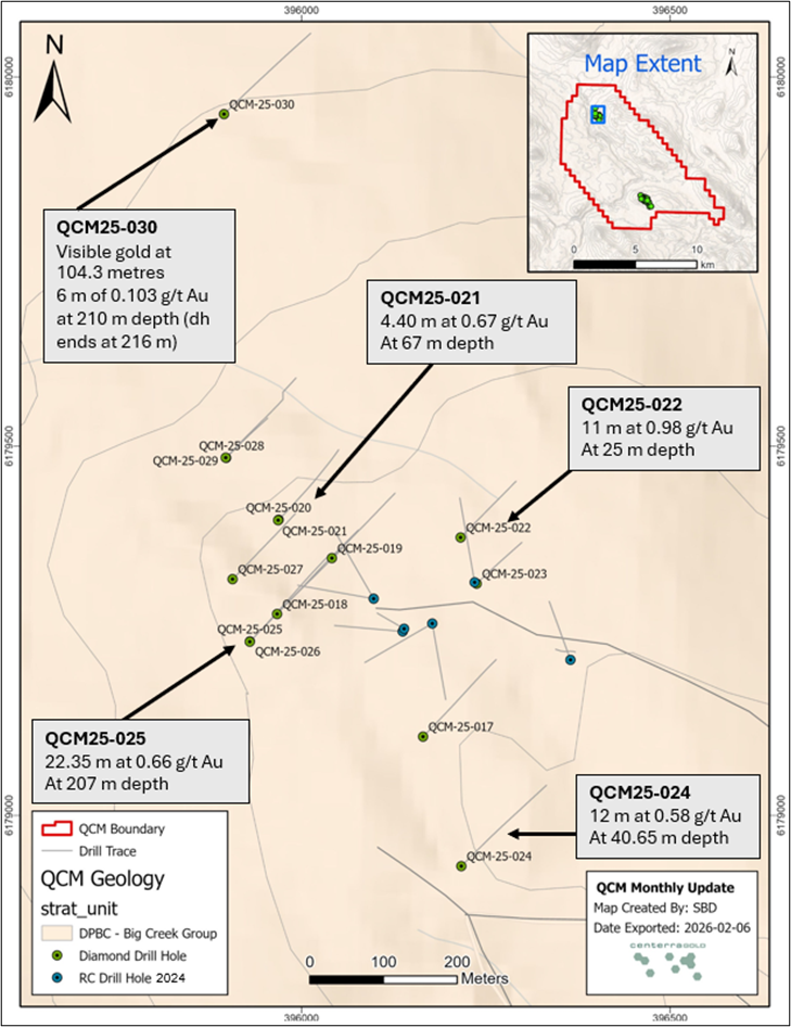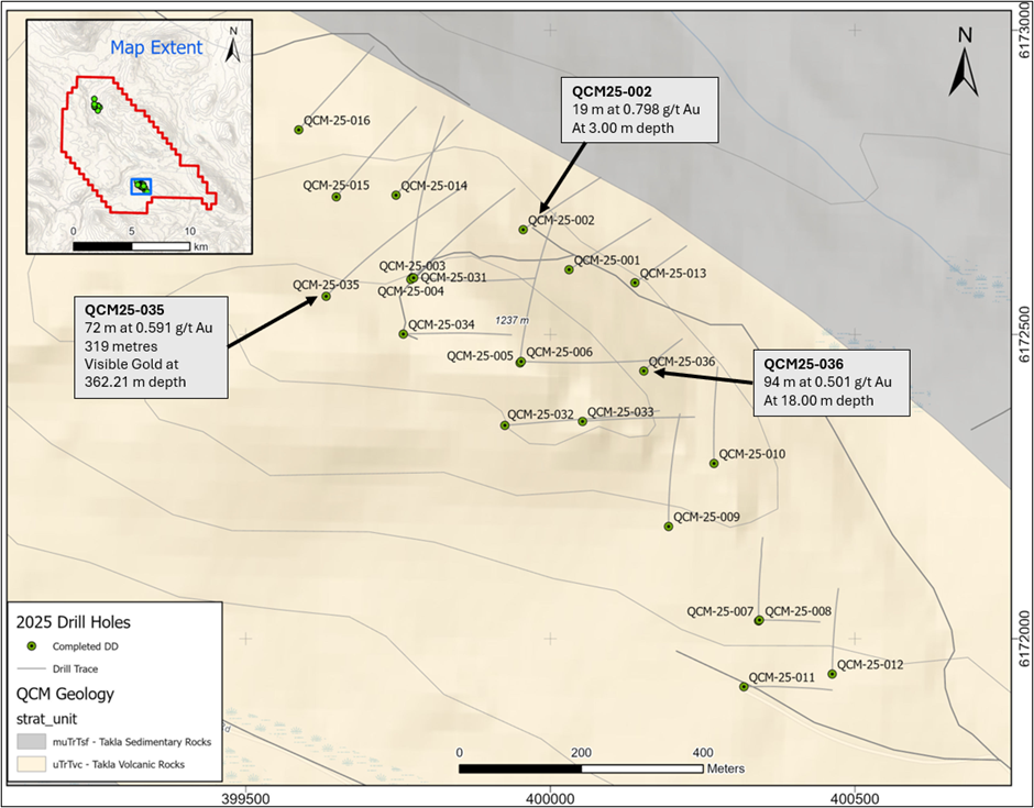 Main Zone – diamond drill intersections up to 93.94 metres of 0.501 g/t Au (drill hole QCM25-036).