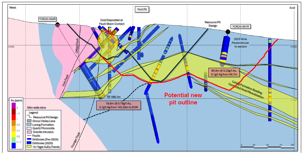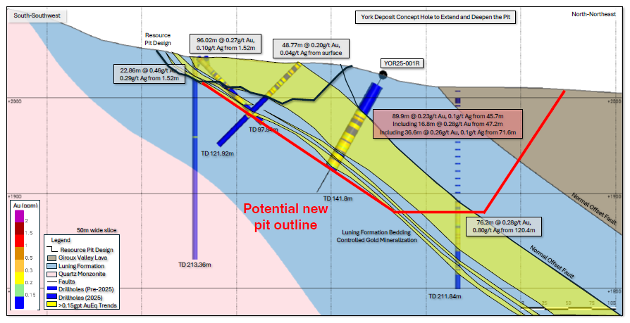 Cross section through drill hole YOR25-002R (see location map for line of section). Combined with the results from YOR25-001R, the drilling confirms the potential to expand the York conceptual pit shell as shown in red. YOR25-002R bottomed in oxide gold mineralization grading 1.0 g/t Au Eq. This intercept may correlate with the thick zone defined by YOR25-002R and therefore defines an excellent target for future resource expansion drilling (black dashed line).