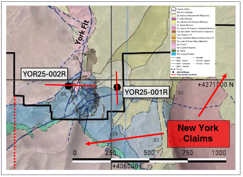 • York: 89.9 metres (45.7 – 135.6m) grading 0.23 g/t Au (YOR25-001R): A very shallow, thick, intercept of oxide gold mineralization that greatly expands the footprint of the York gold zone and confirms the potential to expand the York gold resource along strike and down-dip, leveraging the upside value of the recently announced York claim acquisition (please see cross section below).
